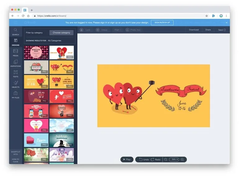Crello includes an inspiration section too, allowing you to start creating graphics for occasions and events. So in other words, if you’re looking to create your own Valentine’s Day Facebook post, you’ll find some great examples on Crello!