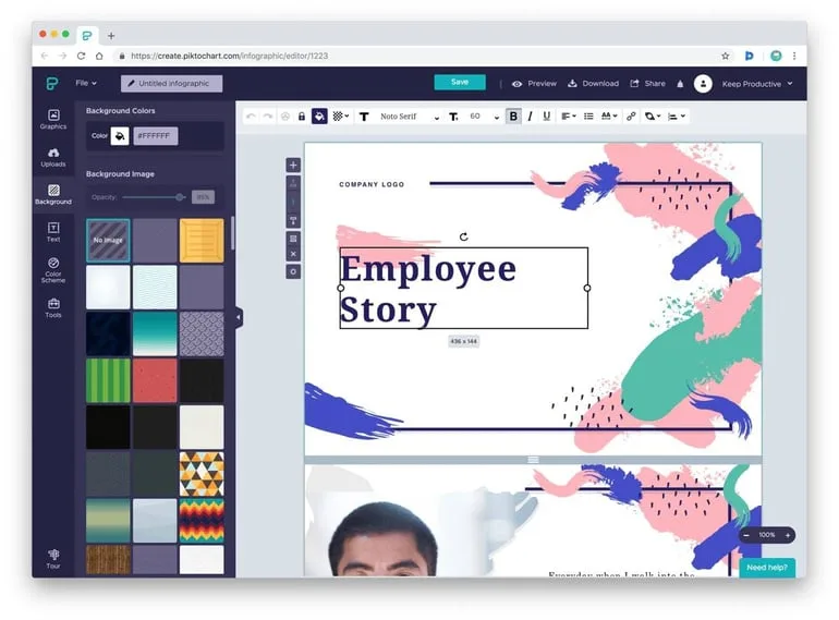 The editor is surprisingly easy to get the hang of, and with 32 million charts and infographics created on Piktochart, it’s becoming very popular.